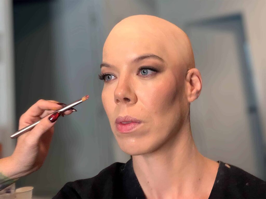 Unser Model Denisa trägt bekommt eine Glatze – und genau das macht den Reiz aus.